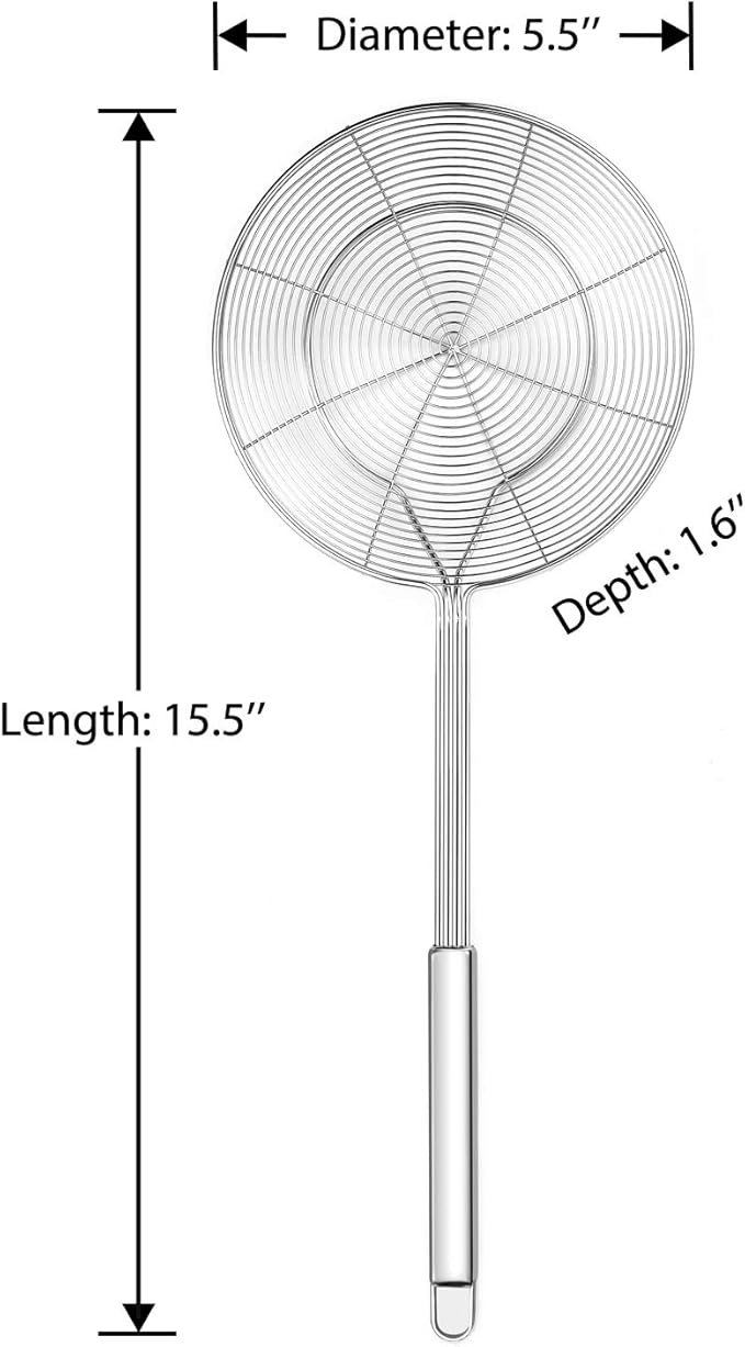 Total length: 15.5 inches. Bowl diameter: 5.4 inches. Depth: 1.6 inches. Perfect for scooping and draining large quantities of food like fries, dumplings, eggs, seafood, or fruits.