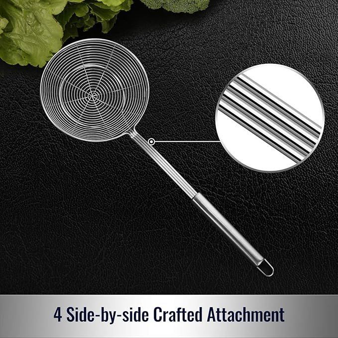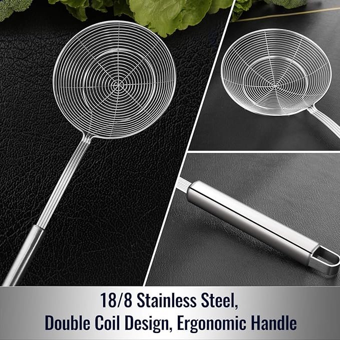 The double-coil wire structure holds food securely while draining oil or water quickly. Ideal for fast, large-batch frying and cooking without losing heat.